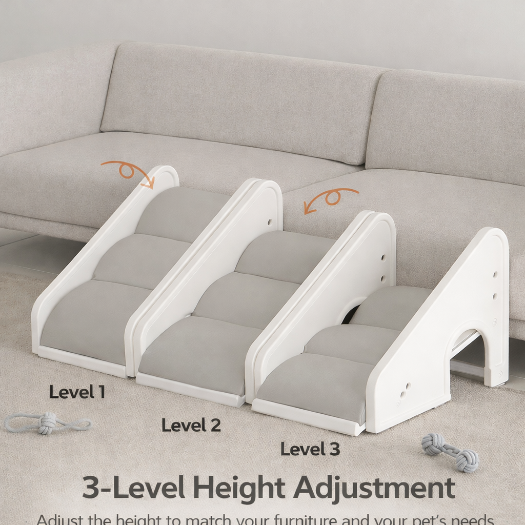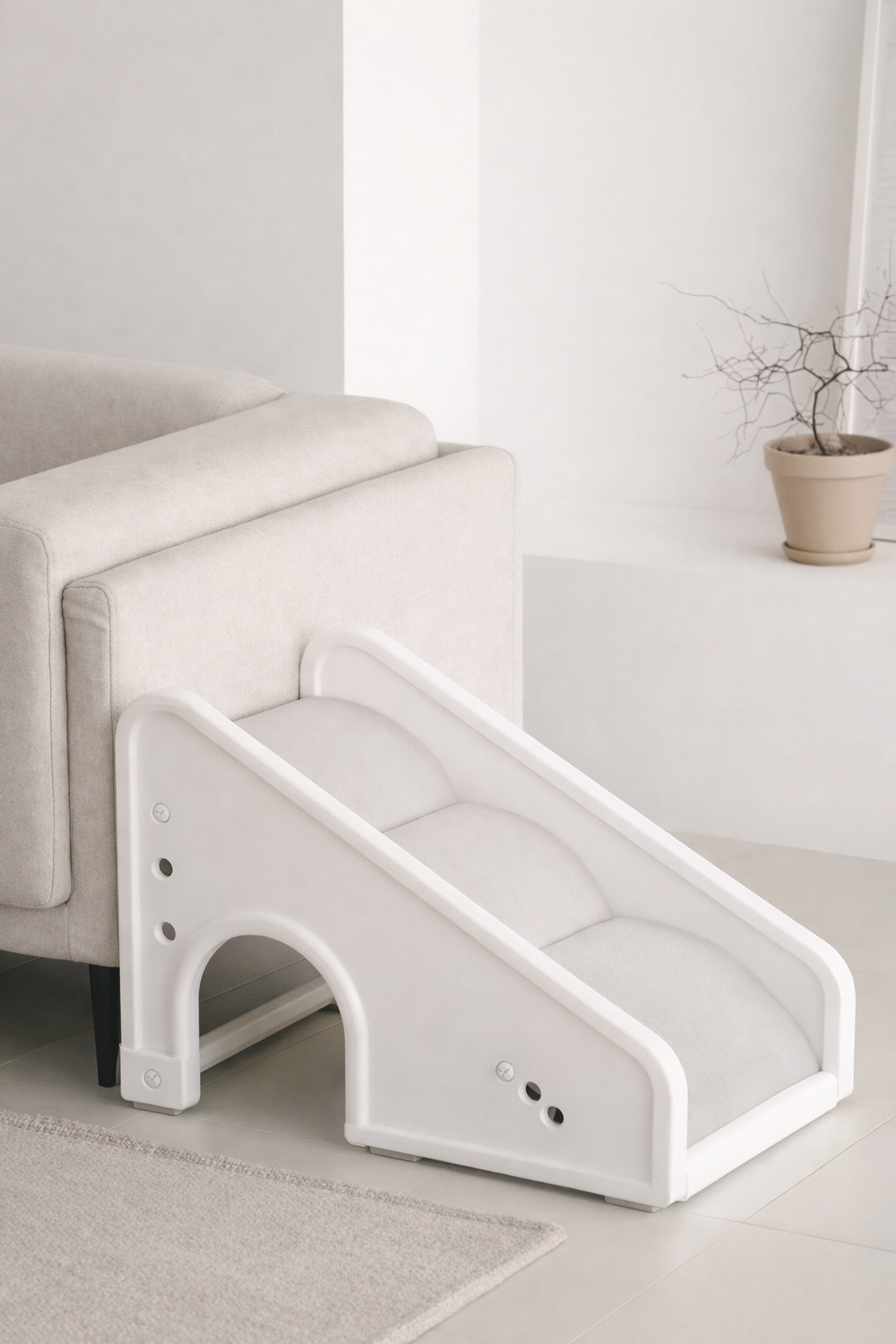The ramp has soft, cushioned steps for small paws. The strong frame keeps it stable while in use. The surface is gentle on joints, and the wide steps make climbing feel natural and unthreatening for tiny dogs. Its clean, modern look blends seamlessly into your home without feeling bulky or intrusive.